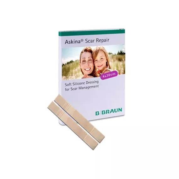 Askina® Scar Repair is a soft silicone self-adhesive occlusive sheet. It is designed for the management of hypertrophic and keloid scars and the prevention of hypertrophic or keloid scarring after surgery on closed wounds.